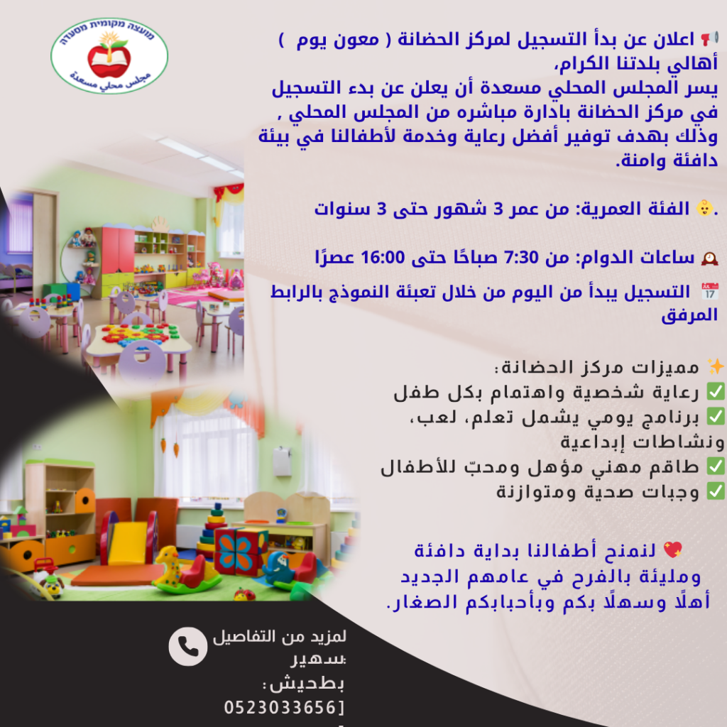 يسر المجلس المحلي مسعدة أن يعلن عن بدء التسجيل في مركز الحضانة بإدارة مباشره من المجلس المحلي , وذلك بهدف توفير أفضل رعاية وخدمة لأطفالنا في بيئة دافئة وامنة.